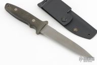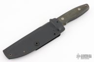 This Model 30 Battle Guard by Bob Terzuola features a bead blasted spear point blade with a sharpened top edge and notched thumbrest, .201" blade stock and 1.130" blade depth, hidden tang construction. The handle is black linen micarta with non-slip grip on the bottom of the handle and a lanyard hole. Comes with original kydex sheath. Has some scratches and light staining, otherwise good condition. "128G" on the bottom of the ricasso.