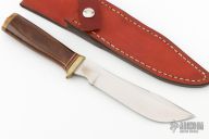 This Large Skinner by Heath features a satin finished blade with false top edge, .212" blade stock and 1.288" blade depth, hidden tang construction. The handle has a brass guard and butt, wood handle with red and white spacers. Has a few light scratches, a small gap between the wood and the spacers, otherwise good condition. Comes with a brown leather sheath, but it does not really fit the knife.