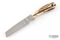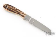 This Sheepsfoot by John Bartlow features a hand rub satin finished blade with .126" blade stock and .675" blade depth, full tapered tang construction. The handle dovetailed stainless steel bolsters and stag scales with lanyard tube. Excellent condition.