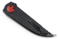 This Phoenix model sports a black handle with a phoenix laser etching and a CPM-S30V steel blade with a red cerakote finish. The top edge of the knife has been sharpened.