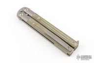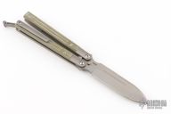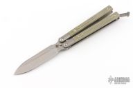 The SPD Invictus-Bali OD Green MIcarta is a utility butterfly knife, featuring titanium billet handles with canvas micarta scales, a Böhler M390 blade, bronze bushing pivot, and a titanium spring latch. Additional details include jimping on the ears and back spacers, and a billet titanium pocket clip. Comes with a zippered case. New condition.