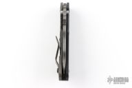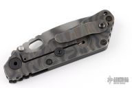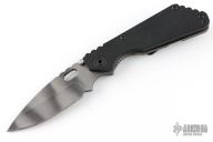 This Strider SNG framelock folder features a tiger striped blade with thumbhole and notched thumbrest. The handle has a black G-10 and flamed titanium frame with titanium clip, tip up carry. Jimping on blade spine. Nice lockup, detent, and blade seating. Has scuffs and scratches throughout, has some light staining, good user condition.