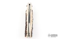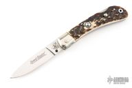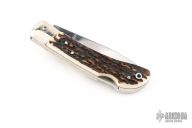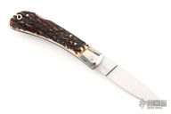This Speed Hunter has a mirror polished blade, high polish nickel silver bolsters, and stag scales, stainless steel liners. Well made with quick strong action. Slide safety switch. Has scuffs and scratches, good condition otherwise.
