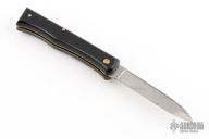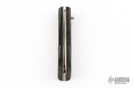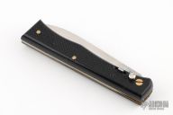 This Vintage Side Opening Auto by Florinox has a polished drop point blade. The handle is knurled plastic. Push the button to fire, safety below the button. Comes with a zipper case. Has some scuffs and scratches, good condition otherwise. This knife does not lock open.
