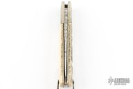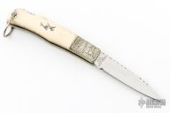 This lockback from Sam McDowell features a surgical steel mirror polished blade with fileworked spine and nail nick. The handle has engraved nickel silver bolsters with nice scrimshaw on the ivory paper micarta scales, nickel silver liners and fileworked stainless steel backspacer, has a lanyard bail. Signed "Sam McDowell Bequia, West Indies 2003" and "Fairwinds and Following Seas Pacific Tweed" on the edges of the scales. Comes with an alligator leather slip sheath. Has a couple light scratches, otherwise excellent condition.