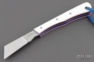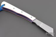 This knife by David Lancaster Clark features a satin finished blade with .122" blade stock and .745" blade depth, full tang construction. The handle has white G-10 scales with red and blue G-10 liners, gray G-10 pins. Comes with a zippered case. New from maker.