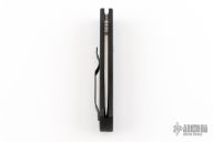 This CQC7 A Side Opening Auto has a black finished 154-CM drop/ spear point blade with swedge and notched thumb rest. Handle is black knurled aluminum with lanyard hole, safety, and black finished stainless steel tip up/ down reversible RH carry clip. Includes nylon velcro sheath and original box and paperwork. PR2#62. Has some scuffs and scratches, great condition otherwise.