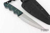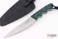 This Bowie by David Lancaster Clark features a satin finished blade with false top edge, .166" blade stock and 1.517" blade depth, full tang construction. The handle has green G-10 scales with gray G-10 liners and brass pins, fileworked spine. Comes with a kydex sheath. New from maker.