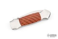 This Lockback from Robert Sidelinger features a hand rub satin finish blade with false top edge and dual thumbstuds. The handle has a mirror polished stainless steel frame with fluted wood inlays over stainless steel backspacer.  S/N 800.  Includes a felt Velcro pouch.  Excellent condition.