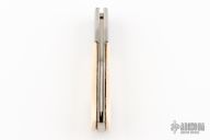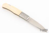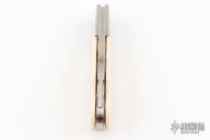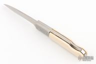 This stunning lockback folder from Seizo Imai features a hand rubbed satin finished clip point blade with nail nick. The handle features pinched Damascus bolsters with bone scales and nickel silver liners. Light scratches are visible on the bolsters and blade. The scales and glue are separating from the liners .045" gap between them at its widest. Fair condition.