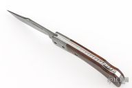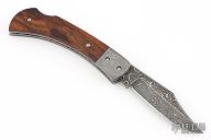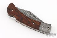 This lockback by Ted Moore features an Alabama Damascus blade with nail nick. The handle has Damascus bolsters, ironwood scales, stainless steel liners and a fileworked stainless steel backspacer. Comes with a zippered case and COA. New from maker!