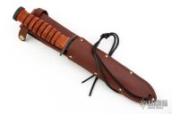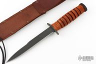 This knife features a black blade with a sharpened top edge, .190" blade stock and .893" blade depth, hidden tang construction. The handle has a black steel guard and butt with stacked leather grip. Comes with original box, papers and brown leather sheath. Has some scuffs, otherwise excellent condition.