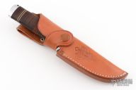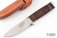 This Idun by Fallkniven features a satin finished VG10 laminated steel blade in convex grind and hidden tang construction. Blade is .194" thick and 1.193" deep. The handle has a stainless steel guard, stacked leather handle with black, red, and white spacers, and an aluminum butt cap. Comes with brown leather sheath and box. Has some scratches, great condition otherwise.