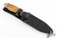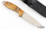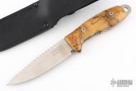 Comes with original box, sheath, and scales. Has wood scales attached and a sawtooth top edge. Has some scuffs, excellent condition otherwise. .15" bladestock 1.332" blade depth.