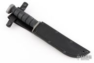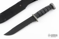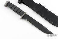 This Extreme Fighting Knife by Ka-Bar features a black partially serrated black blade, .167" blade stock and 1.239" blade depth, hidden tang construction. The handle has bead blasted aluminum guard and butt with a black rubber grip. Comes with black nylon sheath and original box. Excellent condition.