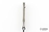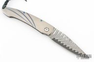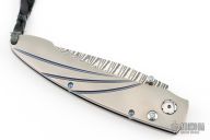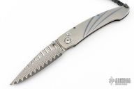 This button lock folder by William Henry features a Wave Damascus blade and satin titanium frame with anodized blue accents and fittings. Blue topaz insets in thumbstud and push button. Includes original box, sheath and certificate of authenticity dated Octover 9, 2006. Has a couple very light scratches, otherwise excellent condition.