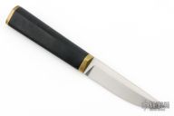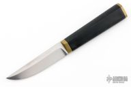 This Tapio Wirkkala Design pukko by Hackman Finland features a satin finished blade with .175" blade stock and .929" blade depth, hidden tang construction. The handle has brass bolster and butt cap and a black composite handle. Has a few light scratches, and some patina. Great condition.