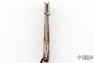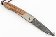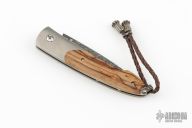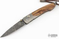 This B10 Tapenade button lock folder by William Henry Knives features a Stainless Dot Matrix Devin Thomas Damascus blade with a single thumbstud with a citrine inlay. The handle has a blasted titanium frame, olive wood scales, push button with critine inlay, lanyard bail with sterling silver bail and beads. Includes box, sheath and papers and COA dated February 18, 2009. Excellent condition.