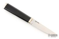 This Sisu by Cold Steel features a mirror polished VG-1 San Mai blade with .142" blade stock and .955" blade depth, hidden tang construction. The handle is comprised of nickel silver bolster and pommel with black micarta handle over hidden tang construction. Has a couple light scratches and some patina, otherwise excellent condition. This model has been discontinued.