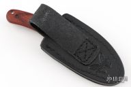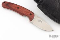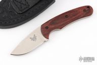 This Activator by Benchmade is a Snody design. The knife features a tumbled finished drop point blade with a notched thumbrest and a full tang construction. .140" Blade Stock. .907" Blade Depth. The handle has wood scales. Includes a black leather sheath. Excellent Condition.