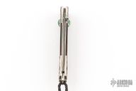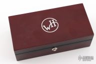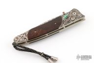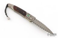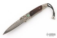 This B30 Cripple Creek from William Henry Fine Knives features a Wave Damascus blade with ZDP-189 core, single thumb stud with a citrine inset in a gold bezel. The handle has a hand carved sterling silver with turquoise skull inlay, ironwood burl inlays, citrine inset in gold bezel on button lock. Leather lanyard with beads on pommel. Includes original presentation box, paperwork dated September 19, 2011, and leather sheath with pocket clip. Excellent condition.