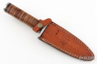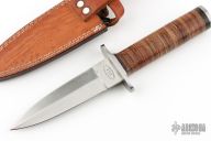 This knife by CFK Cutlery Company features a satin finished dagger blade with .238" blade stock and 1.336" blade depth, hidden tang construction. The handle has a stainless steel guard and butt with a stacked leather grip. Comes with a brown leather sheath. Has some light patina, some light scratches, and rust on the blade edge, otherwise great condition.