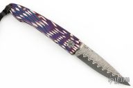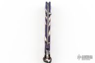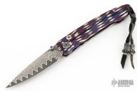 This B10 Sapphire by William Henry Fine Knives features a Wave Damascus blade with ZDP-189 core and a single thumbstud with sapphire inset in gold bezel. The handle has a D. Ealy heat blued carbon Damascus frame with push button with sapphire inset in gold bezel, lanyard bail at the butt. Comes with a leather sheath, box and COA dated August 21, 2006. Excellent condition.
