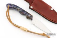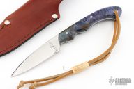 This knife by Rutledge Knives features a mirror polished finished drop point blade with .089" blade stock and .922" blade depth, full tang construction. The handle has blue wood scales with stainless pins and a lanyard hole with lanyard and bead. Comes with a leather belt sheath. Has some light scratches, excellent condition otherwise.