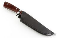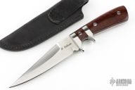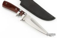 This Sub-hilt fighter by Frank Dilluvio has a hand rub satin finished blade with sharpened top edge, .190" blade stock and 1.293" blade depth, full tang construction. The handle has a stainless steel guard and sub-hilt, wood scales. Comes with a black leather sheath. Has a few light scratches, otherwise excellent condition. Sheath may not be original, doesn't fit exactly correct. Scales have shrunk slightly.