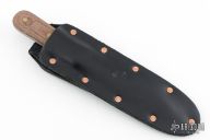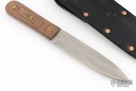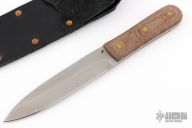 This knife by Jeff Morgan features a hand rub satin finished blade, .150" blade stock and 1.208" blade depth, full tang construction. The handle has micarta scales with Brass pins. Comes with brown leather sheath. Excellent condition.