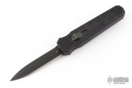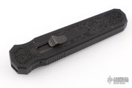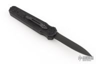 This Harkins Triton OTF Auto has a black double-edged blade. The handle is black aluminum with non-slip inserts and black finished tip down clip. Has a few light scuffs, otherwise excellent condition.