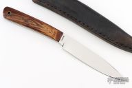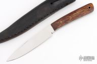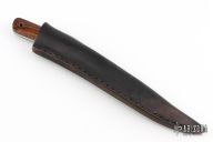 It has a mirror polished blade with .146" blade stock and .907" blade depth, full tapered tang construction. The handle has wood scales with a brass pin and lanyard hole. Comes with a black leather sheath. Excellent condition.