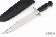This Bill Bagwell Vidalia Maiden "Tribute Knife" by Richard Dawes has a mirror polished blade with false top edge, .325" blade stock and 1.490" blade depth, hidden tang construction. The handle has a 416 stainless steel guard, spacer and pins. The grip is carved African Blackwood with bird's head pommel that has two rubys set in the eyes of the birds head. Comes with a hand tooled black leather sheath by Paul Long and a zippered case. Has a few very light scratches, otherwise excellent condition.