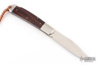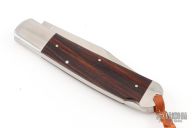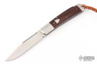 This lockback by AG Russell features a satin finished blade with false top edge and long pull. The handle has pinched stainless steel bolsters, wood covers, stainless steel liners and backspacer. Has lanyard hole and lanyard attached. Comes with original box. Has a couple light scratches, excellent condition otherwise.