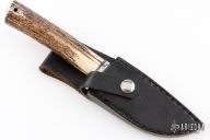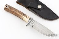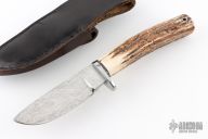 This Skinner by Master Smith Bill Bagwell features a Damascus blade with .319" blade stock at the ricasso and 1.171" blade depth, hidden tang construction. The handle has a polished steel guard with a stag grip, black and steel spacers, lanyard hole at the butt. Includes a black leather sheath and a zippered case. Has some light scratches, otherwise excellent condition for it's age! Made in DeFuniak Springs, Florida in 1977.