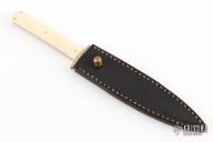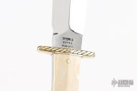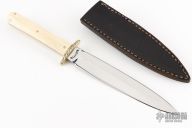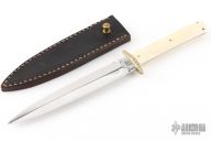 This One of a Kind Engraved Dagger by Bill Bagwell features a double edged mirror polished blade with .182" blade stock and .967" blade depth, full tapered tang construction. The handle has an engraved brass guard with ivory scales and brass pins. Comes with a black leather sheath and a zippered case. Doube Extra Forged stamped on the blade. The guard has been engraved by Bill Bagwell which is very rare. We were told this is the only knife he ever engraved. It can bee seen in catalog #3 as "San Francisco Dagger". Has some light spot on the blade, otherwise excellent condition.