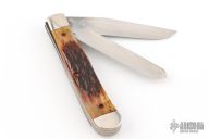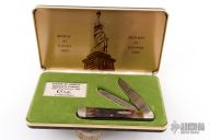 This slipjoint by Case features two mirror polished blades with nail nicks. The handle has jigged bone covers, nickel silver bolsters, brass liners and stainless steel spring. Excellent condition. Comes with original box and papers. #595