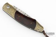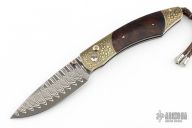This B12 Prairie Ranch by William Henry was a Knife Art Exclusive and is #2 of 5. It features a Koftgari engraved stainless steel frame with 24kt gold inlays, desert ironwood inlays, citrine inlays in thumb stud and push button. The drop point blade is composed of Wave Damascus with a ZDP-189 core.  Includes original box, leather sheath and COA dated June 06, 2012.  Excellent Condition.