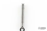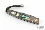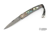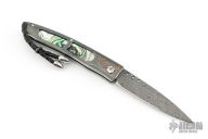 This B06 Caledonia by William Henry features a Rob Thomas Typhoon Damascus blade with nail nick. The handle has a Koftgari engraved stainless steel frame with sterling silver and 24kt gold inlays, abalone inlays, sapphire inlay in push button. Comes with black leather pocket sheath, original box and papers. Excellent condition. #17/25