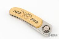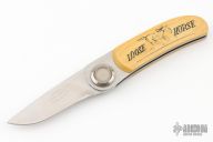 This Paul knife by Gerber has an axial locking mechanism. The handle has yellow paper micarta scales with "loose horse" scrimshaw. Has some scuffs and scratches, good condition otherwise.