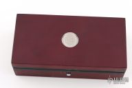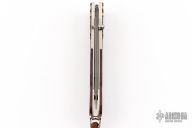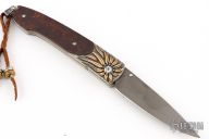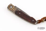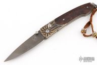 The B10 Seneca by William Henry features a DLC coated San Mai blade with single thumbstud with white topaz inset in gold bezel. The frame is carved sterling silver with 22kt gold inlays, desert ironwood burl scales, white topaz set in gold bezel the button. You'll find additional sterling silver used for the lanyard bail. The piece exudes a sophisticated elegance sure to please any owner. Includes original box, leather pouch, and COA dated February 12, 2008. Excellent condition. #45/50