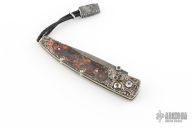 This B10 June 2015 Quarterly by William Henry features a Chad Nichols Boomerang Damascus blade with single thumbstud with spinel inset, matching inset in button. The handle has an engraved sterling silver frame, black ash burl wood inlays, sterling silver lanyard bail with braided leather lanyard and metal beads. Comes with original box, sheath and COA dated June 19, 2015. Excellent condition.