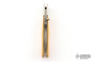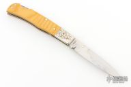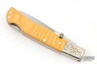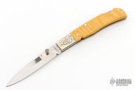 This lockback by Mickey Maddox features a mirror polished blade with false top edge, checkered nickel silver thumbstud. The handle has engraved nickel silver bolsters, vintage paper micarta scales, nickel silver liners, stainless steel backspacer. #064 on blade. Has some fine scratches, on the blade and bolsters, great condition otherwise.