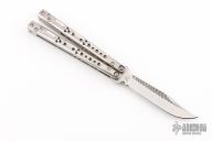 This Balisong by Palethius Designs features a satin finished blade with carved flats. The handles are milled and titanium with matching spacers. Comes with original papers. Excellent condition.