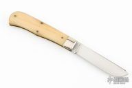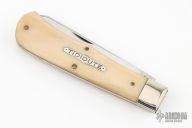 This Beaver Tail Slipjoint by Great Eastern Cutlery features a satin finished blade with a nail nick. The handle has nickel silver bolsters and escutcheon, white bone scales, brass liners and spring. Has half stop, flush in all positions. Includes the original tube and paper. Excellent condition. One of Two Hundred and Fifty.