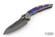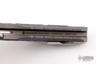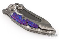 This Titanis by Maxace features a two-tone black blade with notched thumbrest and milled fullers. The handle has a stonewashed titanium frame with timascus inlays, titanium backspacer and tip up clip. Comes with original box, extra hardware and card. Excellent condition.