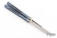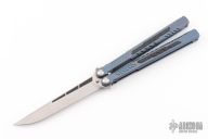 This knife features a satin finished blade with carbon fiber inlays.  The handle features milled and anodized integral titanium handles with carbon fiber inlays.   The innovative new latch design on this Balisongs offers a fresh new take on the old, there is actually a spring inside the latch that pushes against the T at the to create tension.   Includes the original box, t-latch, extra hardware and a trainer blade.  Excellent Condition.