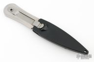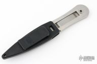 This boot knife by Gerber is a Blackie Collins design, it features a satin finished blade with partially serrated edge, .172" blade stock and 1.072" blade depth, full tang construction. The handle has a clip that holds it in the sheath. Comes with black plastic sheath with nylon outer shell. Has a few light scratches, otherwise excellent condition.
