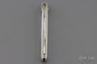 This slipjoint by Remington Knives features mirror polished blades with nail nicks. The handle has nickel silver bolsters with nickel silver liners, pearl covers, and a stainless steel spring.  Consignor note states it was made before 1939. Has bail on the tail. Has some patina, and scratches, great condition otherwise.