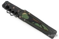 Embodying history and our own design philosophies, Lady Death is our rendition of the classic trench knife. We decided to go big, like no other, with a 15" overall length, and 9 5/8" CPM-Magnacut double-edge dagger blade with a long fuller down the middle. The knuckle duster style handle acts as a guard to protect your hands, and the aggressive outward shape works well for raking. To round out the overall shape, the end of the handle features a pronounced pomel for hammer-striking. The handle is finished with Dirty Olive G10 handle slabs with a checkered texture that is suitable in dry or wet conditions. The handle slabs are attached with Grade 5 Titanium fasteners that are electro-anodized in bronze to round out the look. Lady Death includes a brown leather sheath with a contrasting green canvas inlay. The sheath is ambidextrous, and can be worn on a belt or attached to PALS webbing.